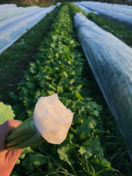 こういう畑では多くの場合、無農薬で虫はついていないけれども、かなりの労力を「虫との闘い」に費やされることになります。虫はその「苦み・エグミ」が大好きなので。