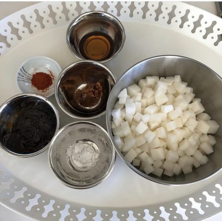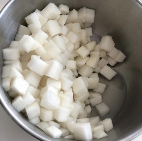⑴1.大根は皮付きのまま1〜2cmの角切りに、2.の塩を混ぜて10分ほどおく