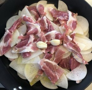 皮ごと切った大根を塩豚と蒸し焼きにするだけの時短レシピ。
