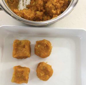 1.⑵のかぼちゃをつぶし、2️⃣砂糖2️⃣塩をいれてよくまぜてから、5-6個に丸める