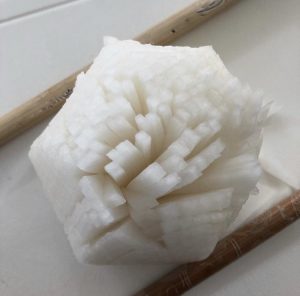 1️⃣2️⃣のかぶは厚めに皮をむか、上下に割りばしを置く(割りばしを置くと下まで切り離さず、丁度良いところで包丁が止まる)