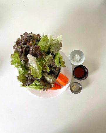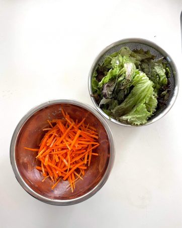 ⑴1️⃣レタスは根の部分を切り、しっかり洗い、水にさらしてから手でちぎる