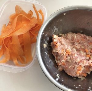 ⑵ 1️⃣にんじんを長いままピーラーで皮を向くように薄く長くスライスしておく(これがしゅうまいの皮になります)