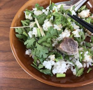 生姜と旬の春菊を使った、塩豚入りの生姜春菊ごはんです!