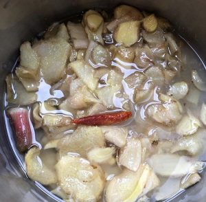 3.鍋を弱火にかけ、沸騰した湯を入れる(この時しょうががしっかりかぶる程度の水を加える、またスパイスを入れたい方はここで加える)
