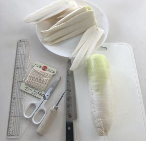 1. 1️⃣の大根の葉を落とし、1.5cm程度の縦割りにする
