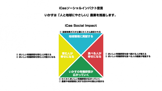 『いかす』は、農薬や化学肥料を一切使用せず、主に緑肥を活用することで有機野菜を生産する農業法人で、これまでも「人と地球にやさしい」農業を推進してきました。この度、日本テレビHDのサステナブル投資を通じた資本提携及び「日テレ共創ラボ」でのプロジェクトを機に、『いかす』として目指す「人と地球にやさしい」を可視化し、経営判断や内外のステイクホルダーへのコミュニケーションへの活用や、より一層の社会的インパクト(影響)の創出に向けて取り組んでいきます。