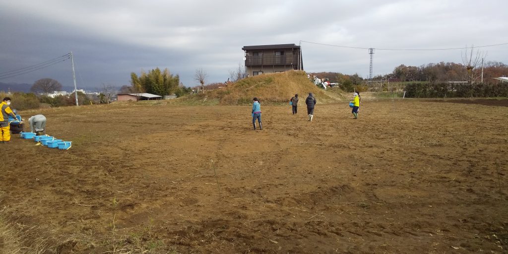午前中の実習は、どんよりとした天候で寒い中で、今年から新しく使い始めた「いかす土沢農園」での肥料まき。ここは、土が硬く、水はけも悪いのがひとめでわかるような畑でした。また、土壌診断で酸性土壌であることもわかったので、11月には苦土石灰をまいて改良。年が明けたらソルゴーを栽培し、有機物の補充と物理性の改善を図ってから野菜の作付に取り組む予定でいます。なので、今日ここで肥料をまく目的は、ソルゴーがよく育つための窒素を補充すること。有機物と微生物資材を混合した肥料は、土壌の微生物層も多様化させてくれるので生物性の改善にも一役かってくれそうです。