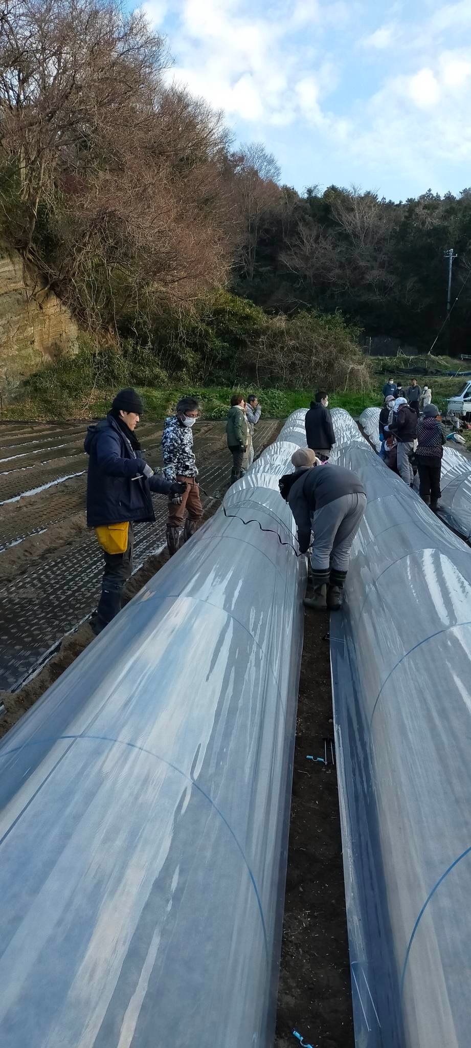 まずは、トンネルの前に、ベタがけ(パオパオと呼んでいる不織布の網で畝を覆う)をしていきます。
