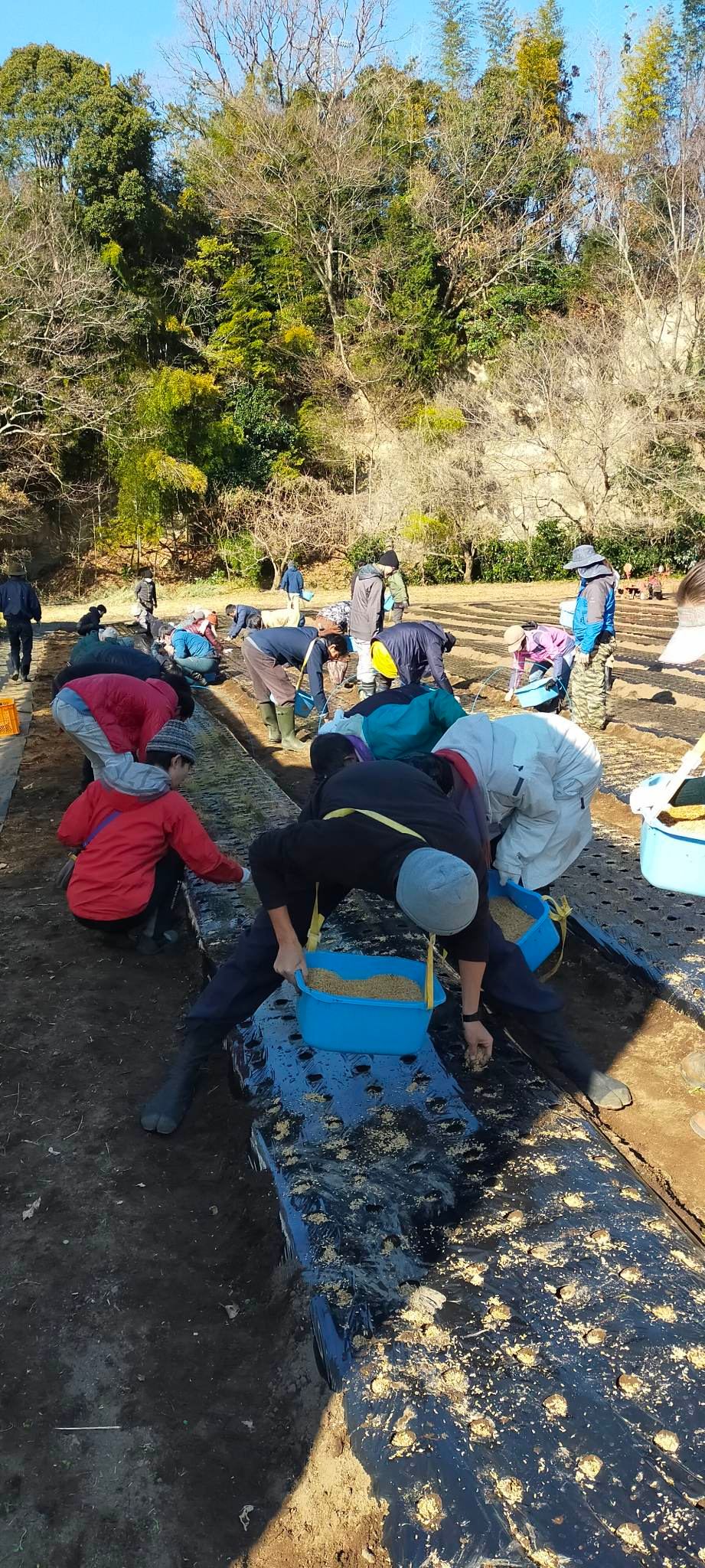 鎮圧後は、乾燥防止のため、1穴ずつ籾殻で表面を覆います。片手で籾殻をつかんで、生クリームを絞るようなイメージで、リズムよくまいていきます。午前中はキリ良く、一旦ここまでの作業となりました。