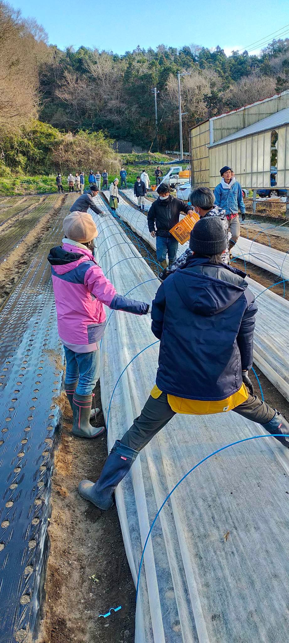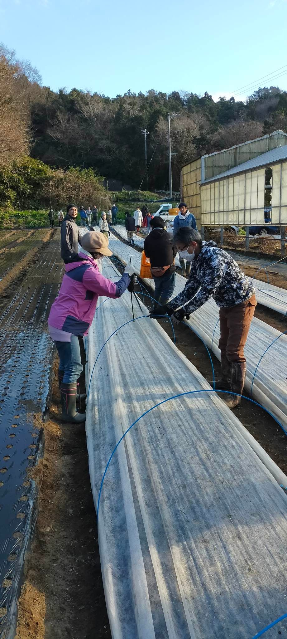 グループごとに畝を分担してトンネルを設置していきましたが、慣れない作業ということもあり、ここでタイムアップとなってしまいました(獣害から畑を守る電柵は、放課後に研修生の方で設置しましのでご安心を!)。