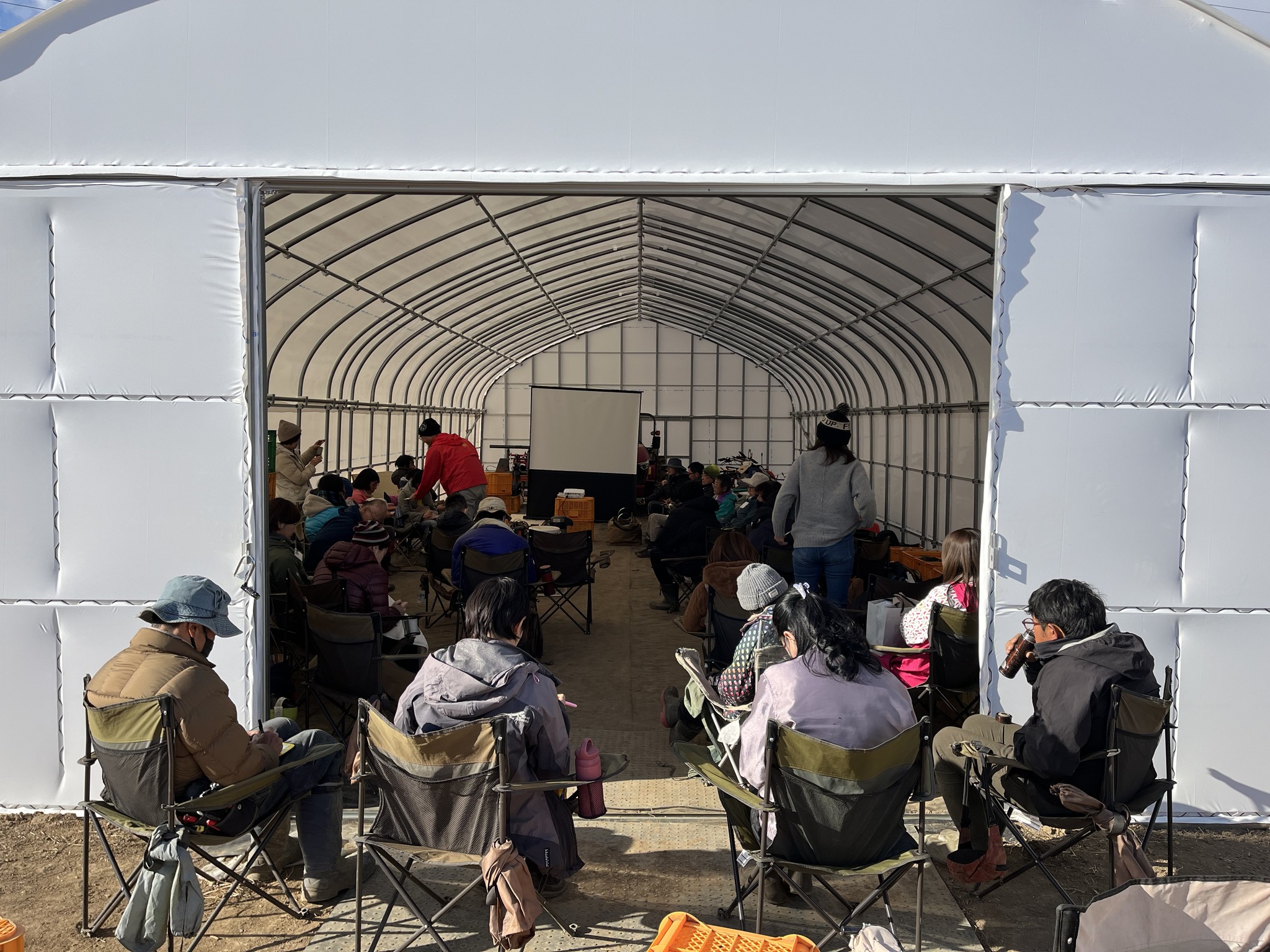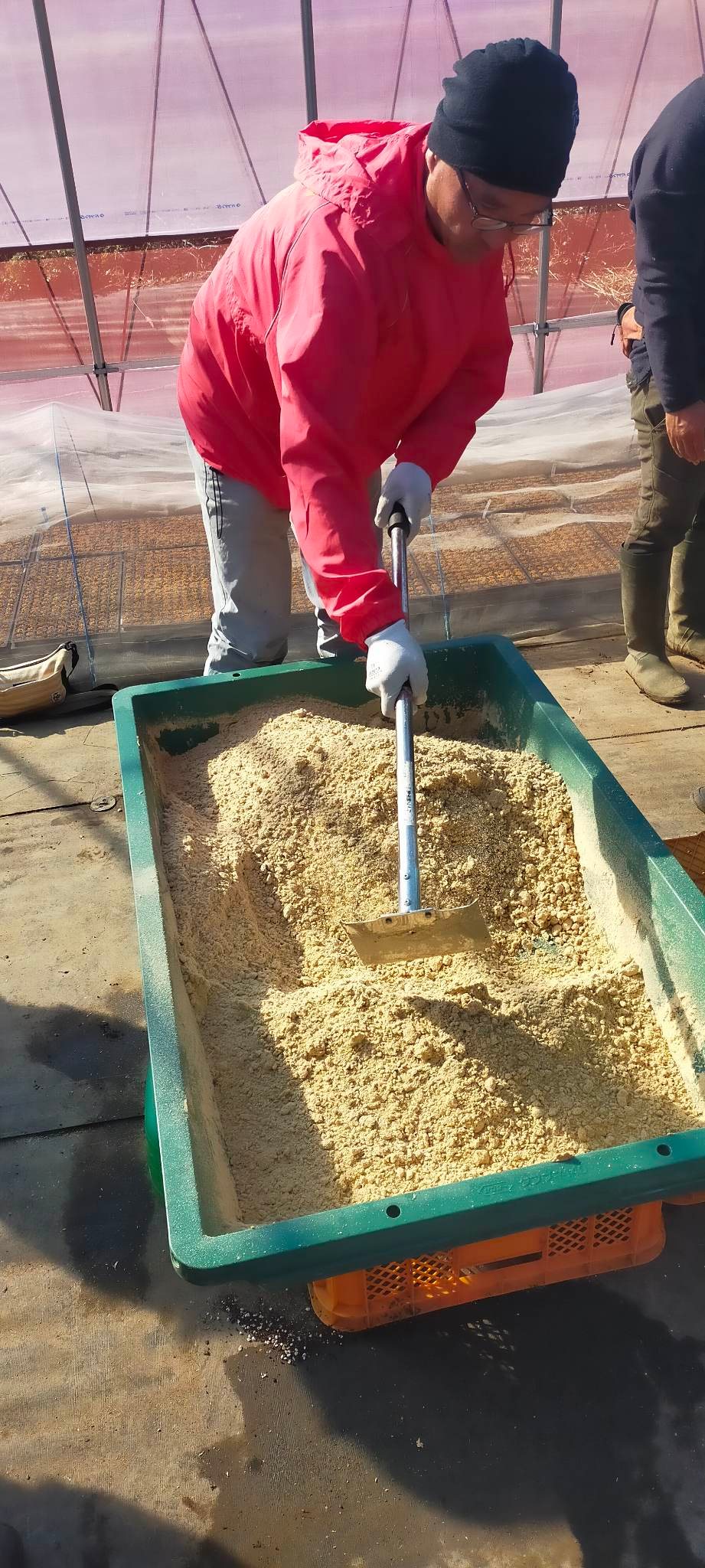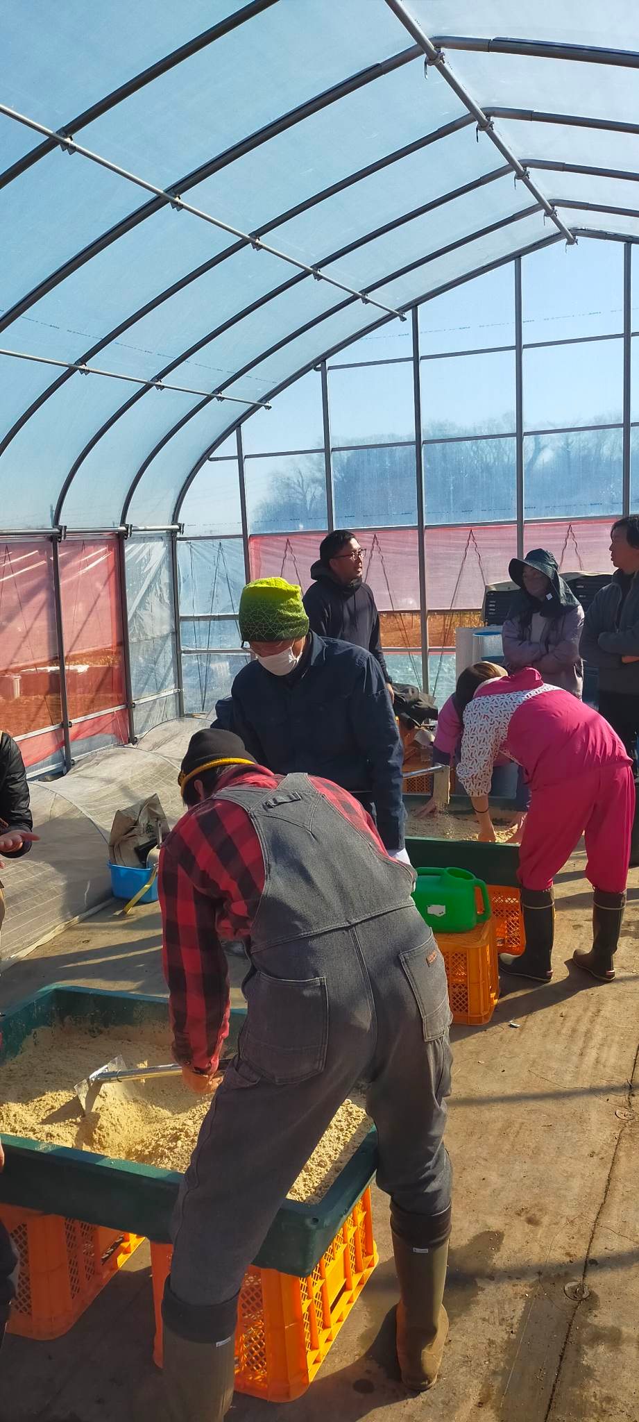 ウォーミングアップ後は、EMぼかし作りのため、育苗ハウスへ向かいます。