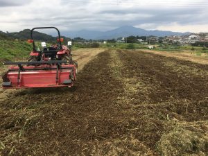チップと堆肥をまいて畑を発酵処理した後、夏緑肥のソルゴーを播種していきます。